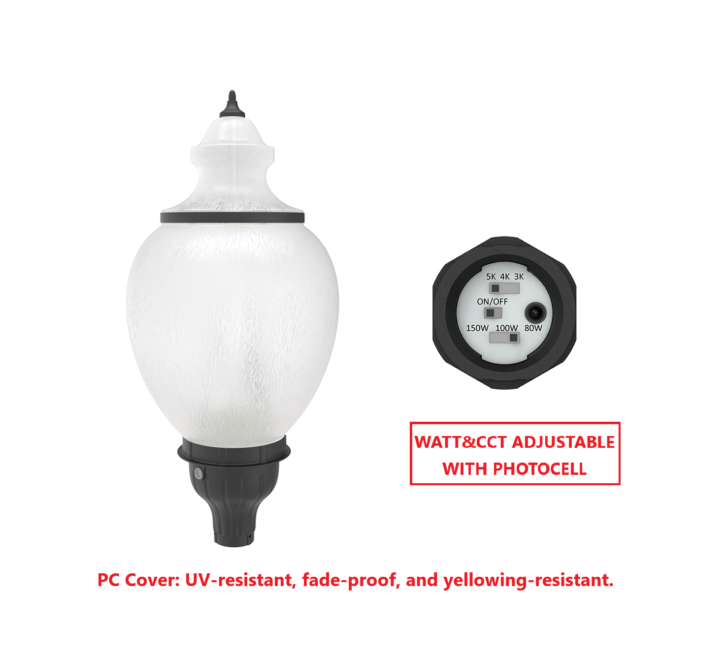 - Acorn cover: High light transmittance PC, anti-UV and fire resistant.